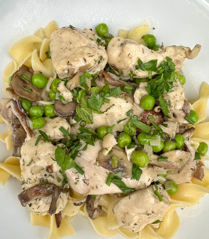 The chicken is returned to the pan to cook through and the liquid reduced by half. At the same time, you’ll prepare the noodles. To the chicken pan, mushrooms, crème fraiche and peas are added and reduced more. I finished the dish with chopped chives, parsley, tarragon and lemon zest. I put the noodles in the individual pasta bowl and topped with the chicken and mushroom mixture. What a wonderful meal. The mushrooms caramelized in the butter, the lemon and herbs added a brightness to the dish and was truly flavorsome. My husband and I both enjoyed this immensely.