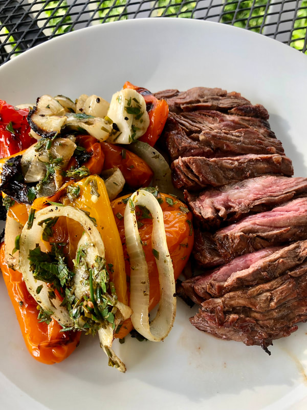 Balsamic and Soy Marinated Skirt Steaks with Charred Peppers