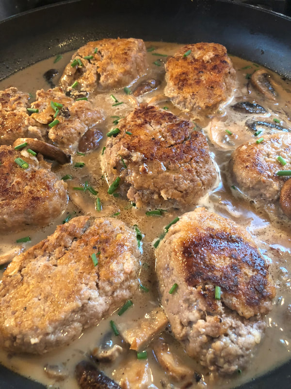 The steaks are sautéed in a skillet with a bit of olive oil. Once browned, they’re set aside so the sauce can be prepared. The remaining onion and mushrooms are added to the pan, seasoned with salt and pepper and cooked until deeply brown. Flour is added to the pan and stirred with the vegetables for approximately 30 seconds to cook out the raw flour taste. The liquids are added along with ketchup, and brown sugar. Taste and adjust seasonings accordingly. The steaks are returned to the pan until the gravy thickens to your likeness. Garnish with the chopped chives before serving.