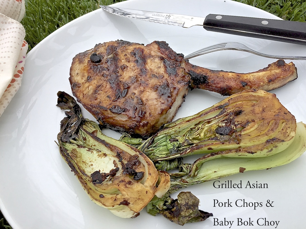 The next, new recipe I prepared was on April 27th, when I made Grilled Asian Pork Chops and Baby Bok Choy, a recipe from Bon Appetit Magazine, August 2004 issue. Wegmans carries pork chops from local farms for $7.69/lb. My husband and I just love these chops. They are flavorful and cook up moist and tender. I took a gamble with this Asian inspired recipe and it was a hit! The other ingredients for this recipe are black bean garlic sauce, garlic, soy sauce, oriental sesame oil, lime juice fresh ginger, cilantro (I omitted), lime and baby bok choy.