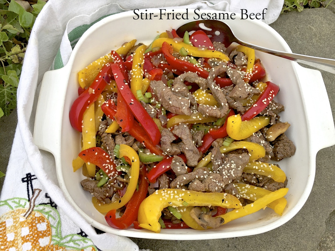 Another meal I created ahead time was stir-fried sesame beef. It's another 45 minute or less, fabulous recipe from Gourmet Magazine, September 1996. I purchased a package of stir fry beef slices at Foodtown in Sea Girt for $5.99/lb. The beef needed to marinate for fifteen minutes prior to sautéing garlic, red onion, red and yellow bell pepper and scallions. Lastly, the meat is cooked; then everything is tossed together.