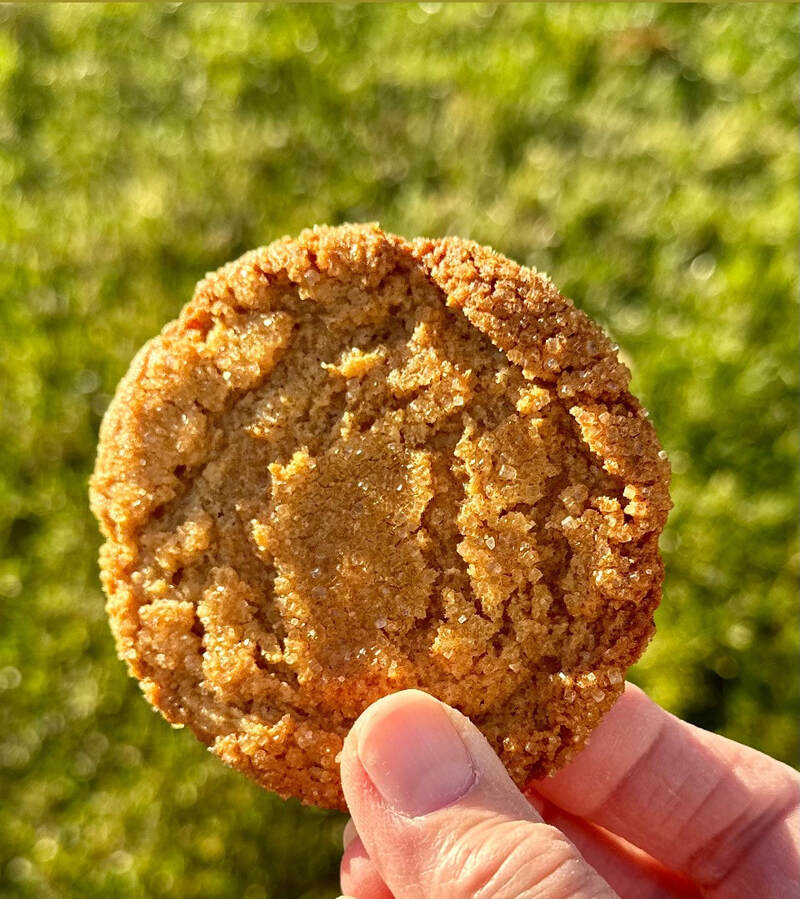 While the recipe calls for 2 heaping tablespoons for each cookie, I opted for smaller cookies. Once the dough balls are formed, they’re rolled in Demerara sugar and placed on a pan. For this step I used raw sugar. I baked them at 350° for approximately 15 minutes or until the edges looked crisp, removed from oven, then banged the cookie sheet on the counter to release the air bubbles and returned to complete baking for another 3 to 4 minutes.