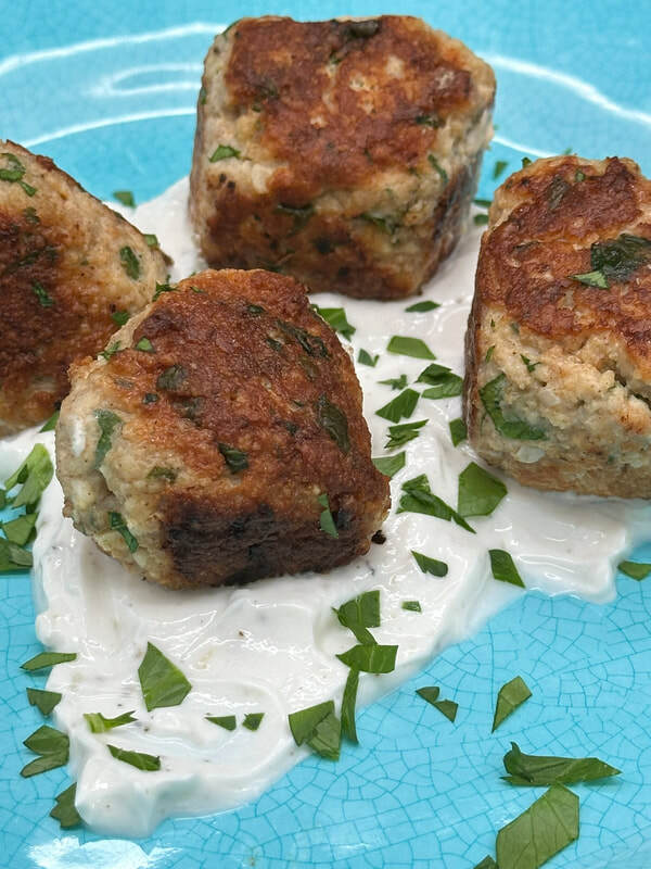 The meatballs are made with yogurt, minced garlic, ground chicken, panko, egg, parsley, olive oil, sugar, paprika, cumin, ginger, cinnamon, salt and black pepper. The mixture is then formed into meatballs approximately 1-1/2-inches in diameter. Using a large skillet and olive oil, the meatballs are pan fried until browned on all sides. To serve, spread the yogurt sauce in an even layer on the flat platter and place meatballs on top. Garnish with chopped parsley and pine nuts (optional). Serve at once.