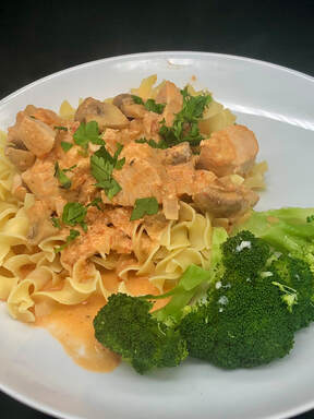 - Add the heavy cream, scraping off any stuck-on bits with a spatula or wooden spoon. Add the chicken, tomato purée, ketchup, mustard, Worcestershire sauce and a large pinch of salt. Stir to combine, bring to a gentle simmer and cook until flavors meld and chicken is fully cooked, about 10 minutes.